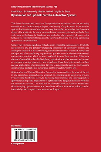 Greater fuel economy, significant reductions in permissible emissions, new drivability requirements and the generally increasing complexity of automotive systems are among the criteria that the contributing authors set themselves to meet. In many cases multiple and often conflicting requirements give rise to multi-objective constrained optimization problems which are also considered. Some of these problems fall into the domain of the traditional multi-disciplinary optimization applied to system, sub-system or component design parameters and is performed based on system models; others require applications of optimization directly to experimental systems to determine either optimal calibration or the optimal control trajectory/control law.